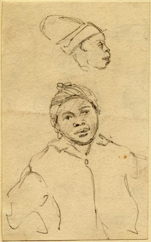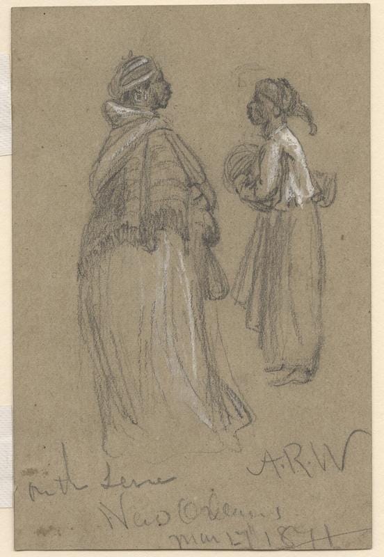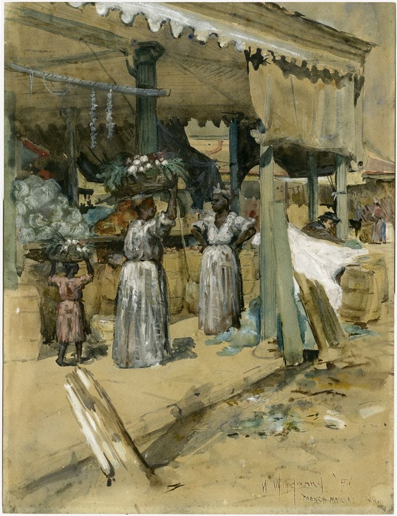 Portrait of a Black woman by Olide Schexnayder, circa 1890s Woman with a basket by Alfred Rudolph Waud, circa 1871 Group portrait of African American musicians by Abel J. LeBlanc, circa 1909-1920 Sketch of two Negro women by Alfred Rudolph Waud, 1870s Praline Mammy by Corinna Morgianna Luria On the Levee, New Orleans by Alfred Waud, 1871 French Market N. O. by William Woodward, 1891 Portrait of an African-American Woman Holding an Ewer by Selina Elizabeth Bres, circa 1893-1896 Held at State Library of Louisiana, Historic New Orleans Collection, Louisiana State University Special Collections via the Louisiana Digital Library