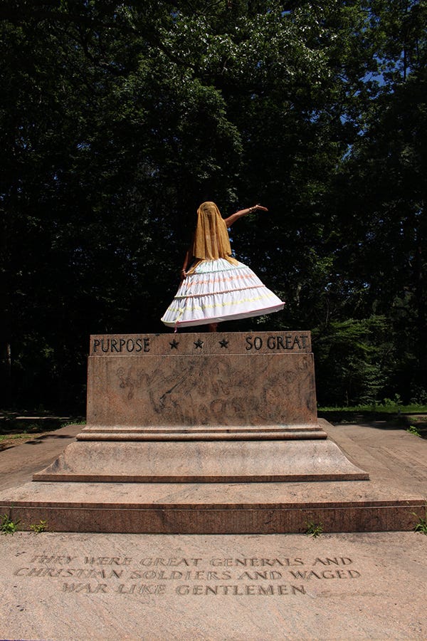 Ada Pinkston, artist and cultural worker, created the performance piece pictured to reconsecrate sites of Confederate monuments around Baltimore City. The LandMarked project is at the link.