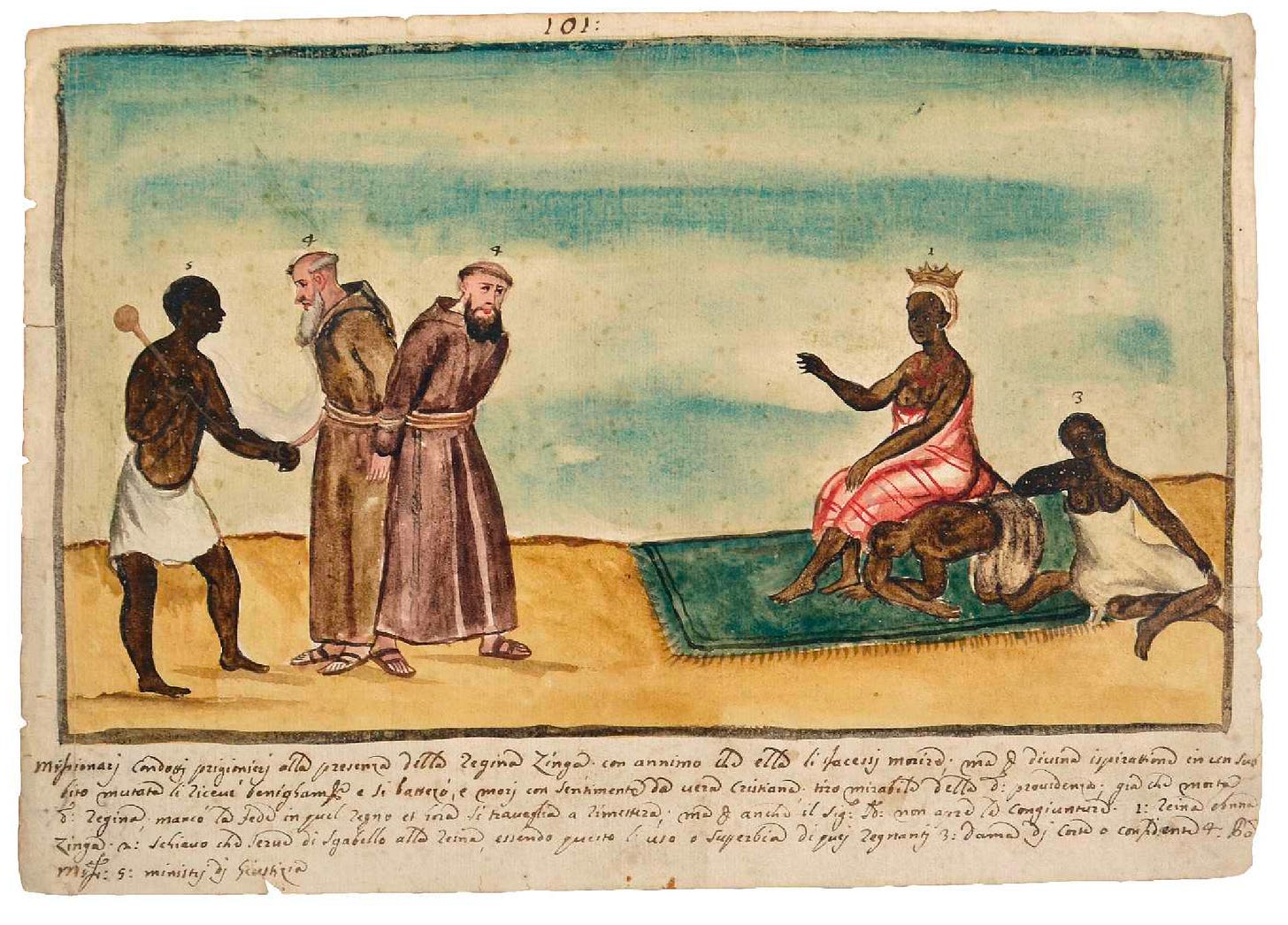 I want to sit with and see 1619 from the other side. We know what it begot on the eastern side of the Atlantic ocean, 20 odd Negroes and all that. But the Portuguese also unfurled another force of nature in Njinga, the daughter and sister of a king, who Ngola Mbande sent to meet the new Portuguese governor in 1621 and negotiate with him on behalf of her brother and Ndongo.