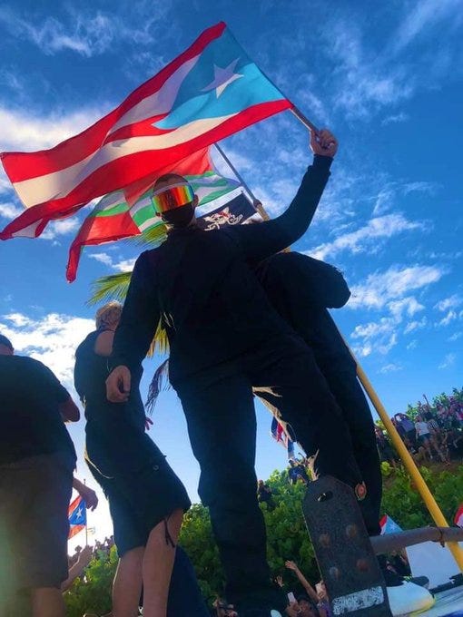 Bad Bunny flies the once upon a time banned sky blue Puerto Rican flag during Verano Boricua (#RickyRenuncia). Read about that summer here. in 2019, mass protests in Puerto Rico ousted corrupt, racist/sexist Governor Ricardo Rossello from office. Yes, that’s the skull and bones, mantle of pirates, on a flag pole behind him. No, Boricuas, have NO chill. None.