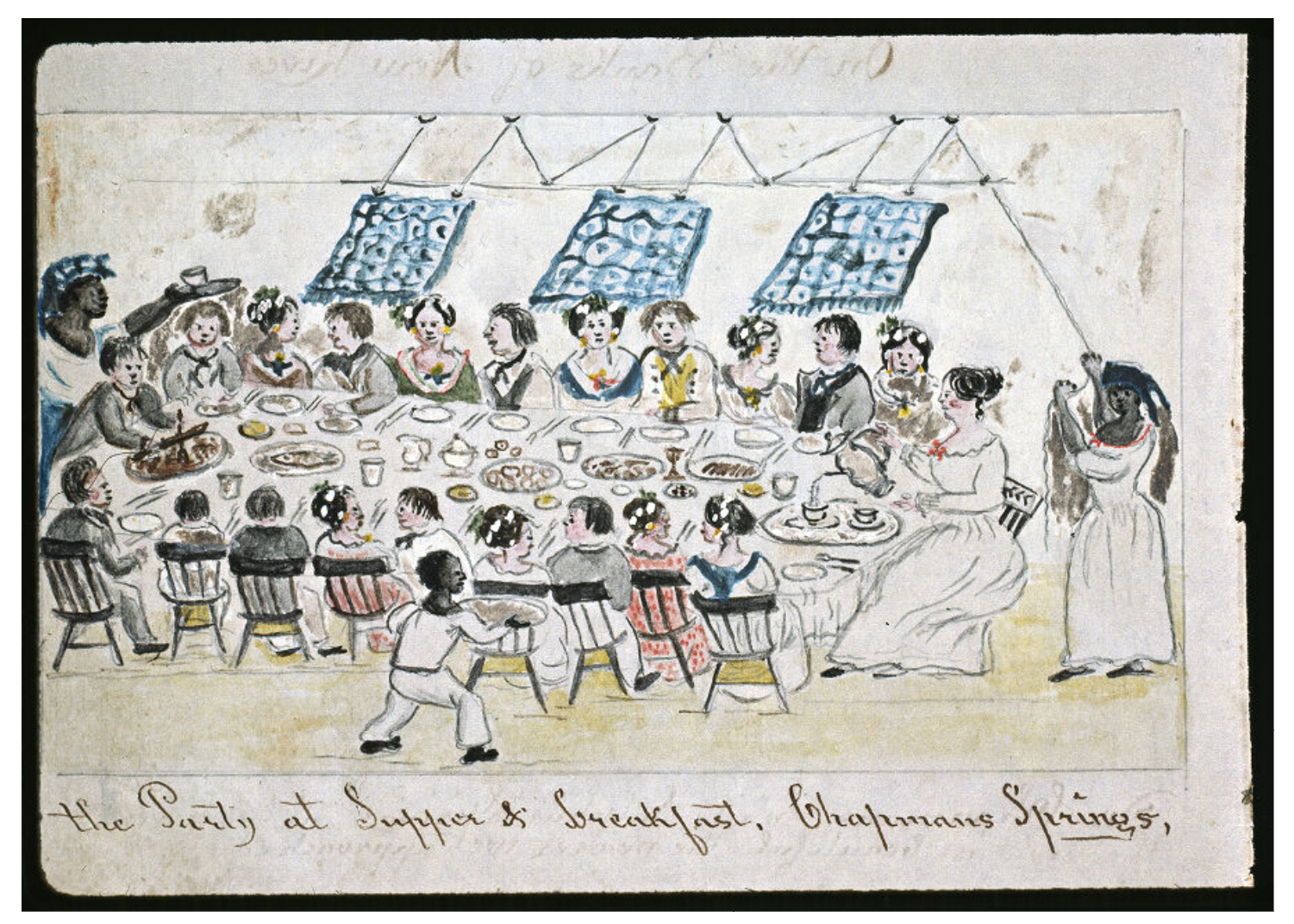 A watercolor drawing from Lewis Millers Sketchbook of Landscapes in the State of Virginia, depicts a dinner party for twenty-one people that was held in July 1853 at Chapmans Springs in Giles County. An enslaved woman and boy serve food and drink, while a third slave cools the guests by controlling the large overhead punkah fans. — Discovery Virginia