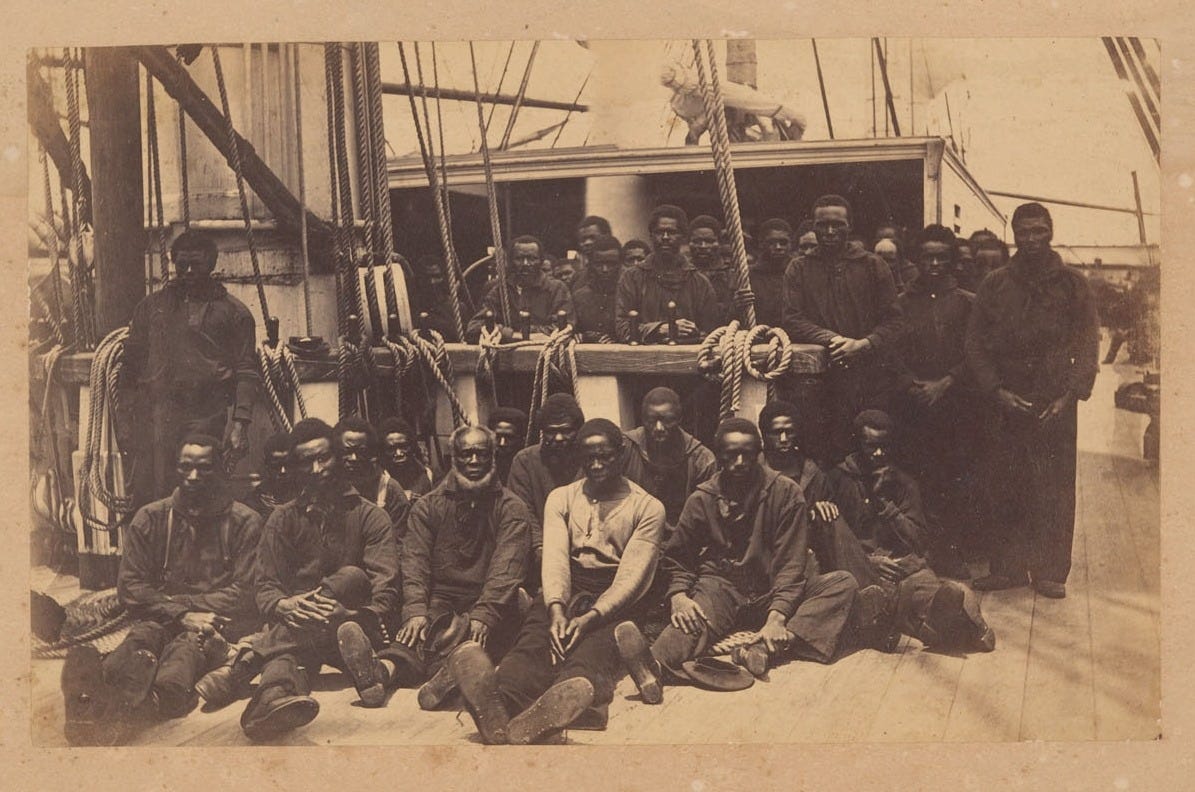 “In late fall 1861 or spring 1862 Henry P. Moore, a New Hampshire photographer, traveled from his home in Concord to make portraits of the Third New Hampshire Regiment in camp in Union-occupied South Carolina. While in residence, he made some of the earliest and most important Civil War photographs of slave life in the Deep South. Moore focused his camera on the changed lives of African Americans in the aftermath of the Union victory (navy and army) at the Battle of Port Royal, South Carolina, in November 1861. With the departure of their plantation owners, coastal plantation workers were no longer slaves but, before the Emancipation Proclamation, not yet free. They were considered contrabands, a term coined by Union General Benjamin Butler to describe their status as conscripted former slaves who had escaped the Confederacy. The U.S.S. Vermont served in the South Atlantic Blockading Squadron as a store and receiving ship, a hospital, and here as the backdrop for one of the war’s most revealing group portraits.” — Discovery Virginia