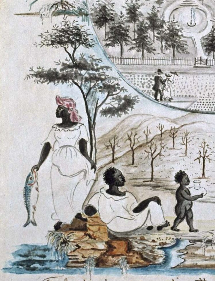 “The title page for Lewis Miller’s Sketchbook of Landscapes in the State of Virginia features a central oval portrait of Richmond’s Capitol Square and environs. Corn and tobacco frame the upper half of the view; beneath the cityscape are rural scenes, including a distant view of slaves hoeing the soil. In the foreground, both African Americans and whites enjoy the James River. The two groups are separated, though the children approach one another. Miller created this title page in 1853, but years later he wrote a postscript on the right margin of the page in which he described a tragic fire that occurred inside the Capitol in 1870. That conflagration killed more than fifty people and injured hundreds more.” — Discovery Virginia