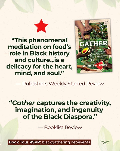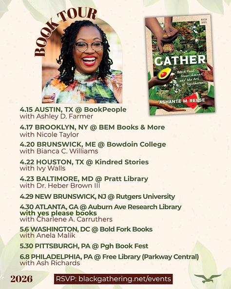 Huge congrats and celebration (I will do this over and over) to brilliant scholar, friend, Capricorn kin and writing group comrade for Dr. Ashanté Reese!!! Her new book Gather (Norton, 2026) is out in less than two weeks! And she just announced her book tour. Thrilled to celebrate her and catch her when she’s in Baltimore!